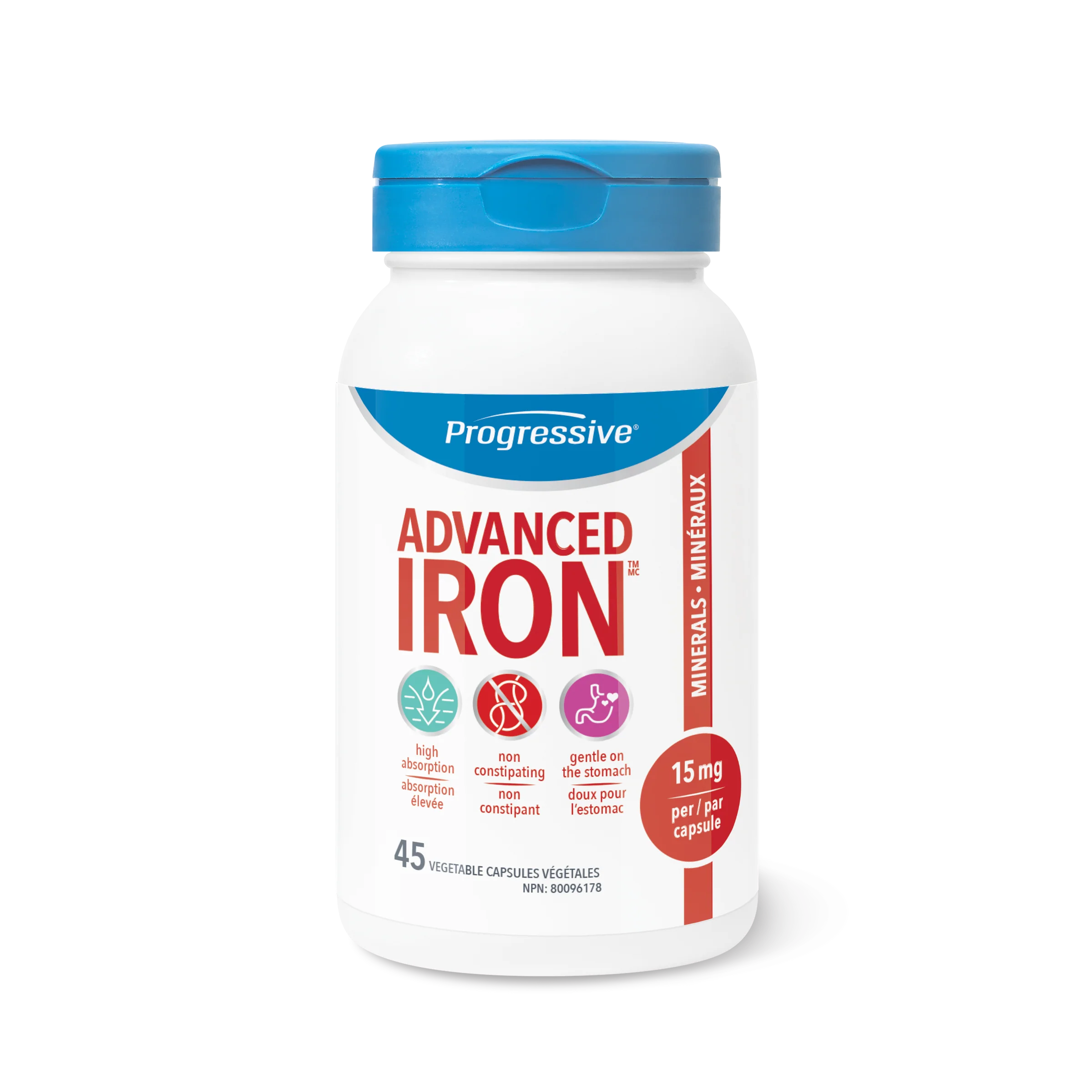 Progressive Advanced Iron features SunActive® Fe, a highly absorbable form of iron that is easy on the stomach. It also contains Vitamin B2 to support iron absorption and folic acid to support the formation of new red blood cells.