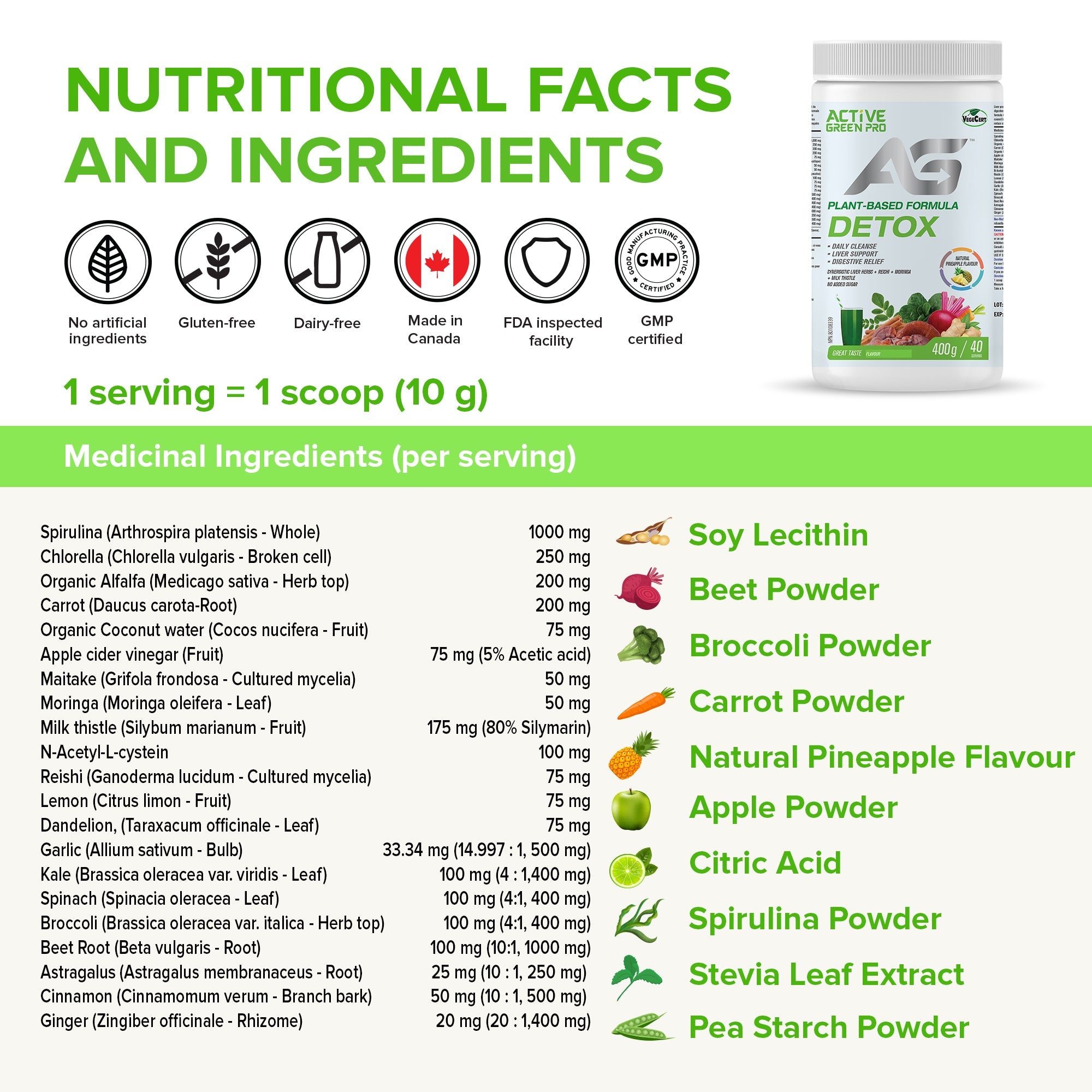 Active Green Pro Detox is available in fruity natural pineapple flavor without any sugar or fillers added. With all non-GMO ingredients, we want to guarantee you a clean and safe formula to consume.