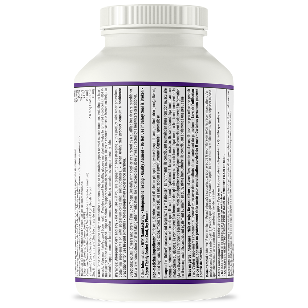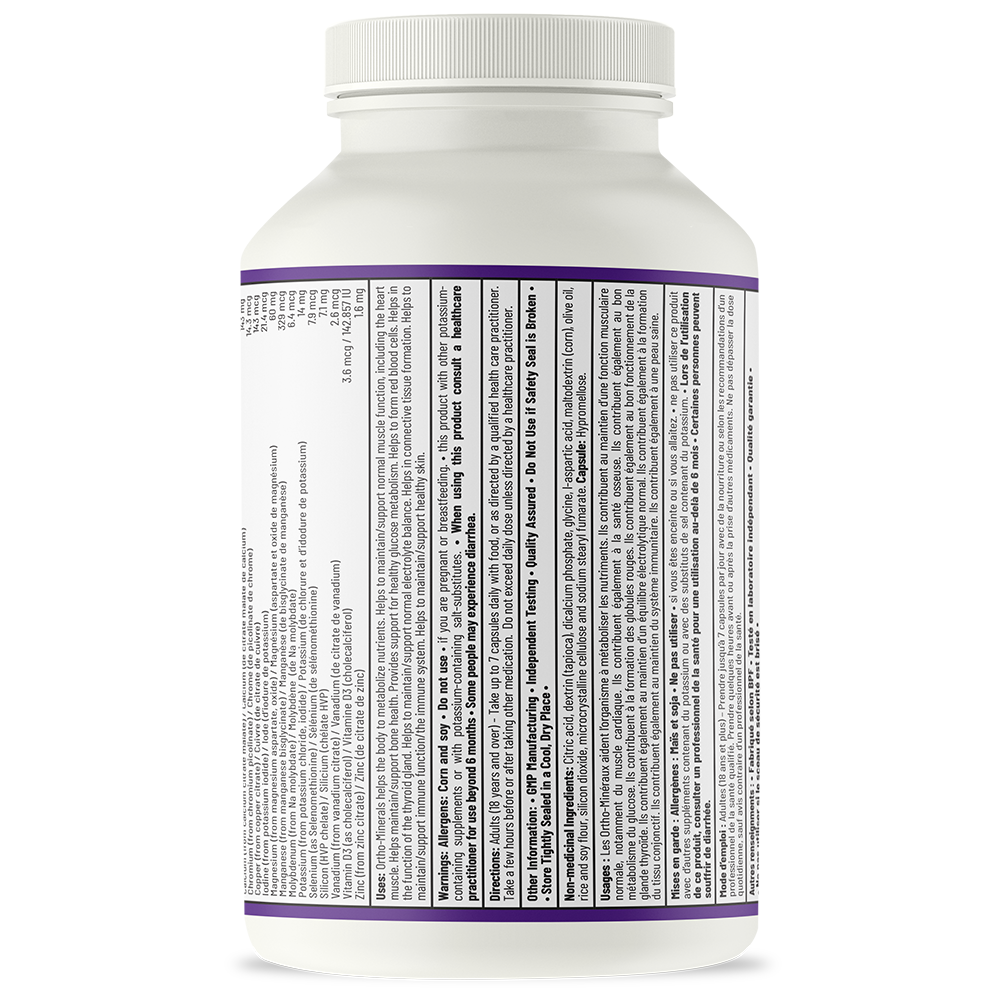 Minerals play a crucial part in countless bodily functions, from nutrient metabolism, bone and teeth development, and healthy muscle function—including the heart—to supporting glucose metabolism, connective tissue repair, red blood cell formation, thyroid function, and immune defense.* Ortho Minerals also contributes to energy production, tissue formation, antioxidant protection, and the maintenance of healthy skin, hair, and nails.* With its carefully balanced ratios and high-quality forms of each ingredient, Ortho Minerals is an ideal choice for anyone seeking to restore and maintain optimal mineral levels for overall wellness.