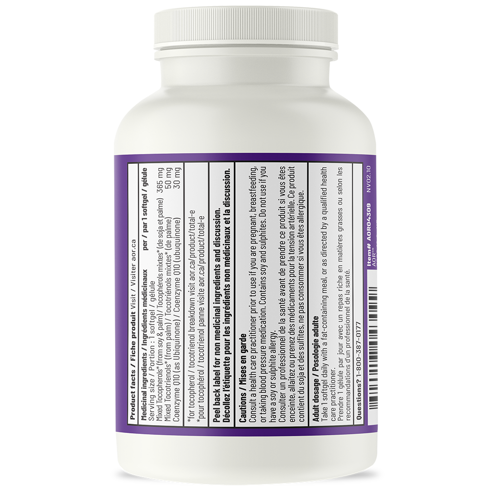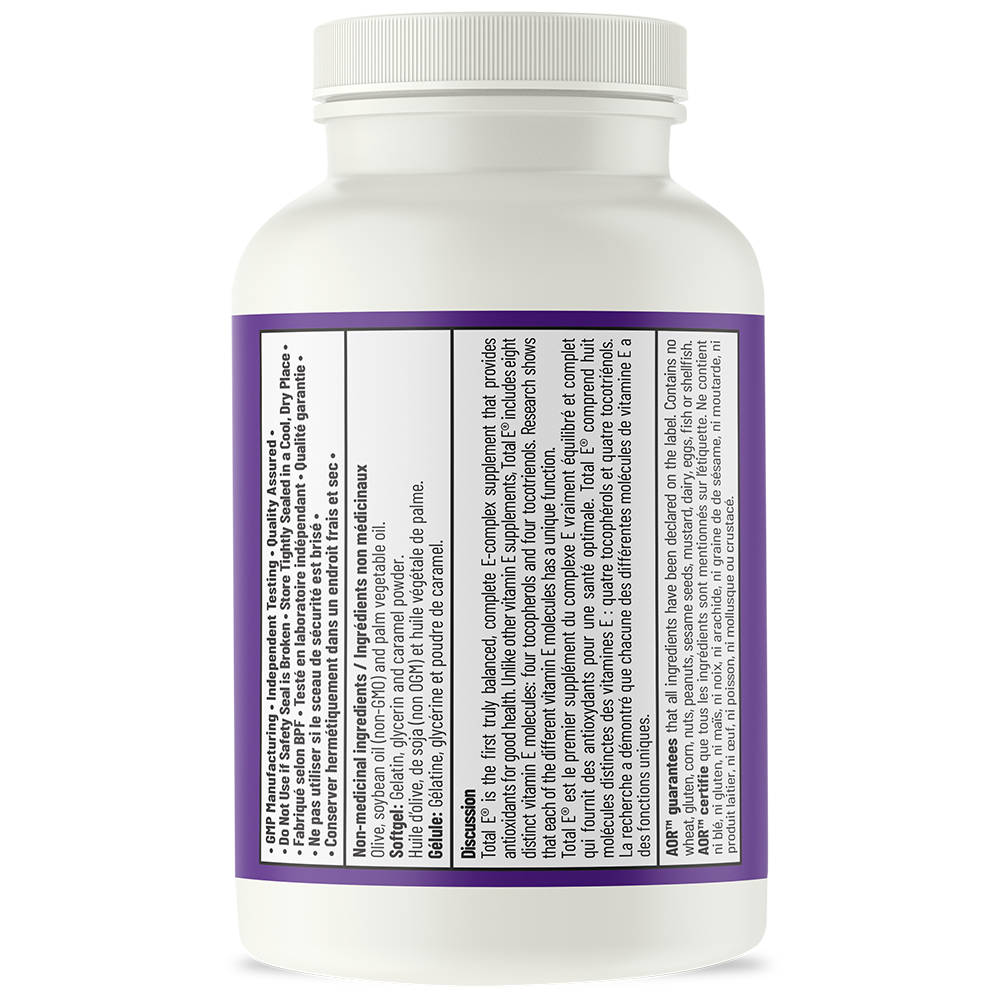 AOR’s Total E™ delivers a full-spectrum, natural vitamin E complex, offering all eight vitamers in their naturally occurring ratios for optimal absorption and effectiveness. Unlike formulas that rely on synthetic ingredients or unbalanced doses, Total E™ ensures a complete and holistic approach to vitamin E supplementation. To further enhance its antioxidant power, the formula includes Coenzyme Q10, which helps regenerate vitamin E after it has neutralized free radicals. As the first of its kind in Canada, Total E™ offers a comprehensive, balanced solution for those looking to support their antioxidant defenses, heart health, and overall cellular protection.