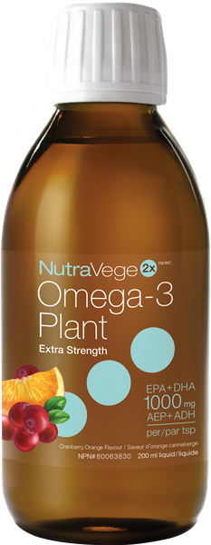 The extra strength vegan friendly omega-3! Until now, only fish and squid oils could provide an equivalent omega-3 potency. Our NutraVege omega-3 offers a pure, plant sourced omega-3, derived from algae. NutraVege Extra Strength delivers 1000 mg EPA+DHA in a delicious Cranberry Orange flavoured, easy to absorb liquid. NutraVege is an easy way to get your daily intake of omega-3 and is a great choice for anyone looking for a pure, plant-based omega-3. NutraVege promotes the maintenance of overall good health, cardiovascular health and brain function.*