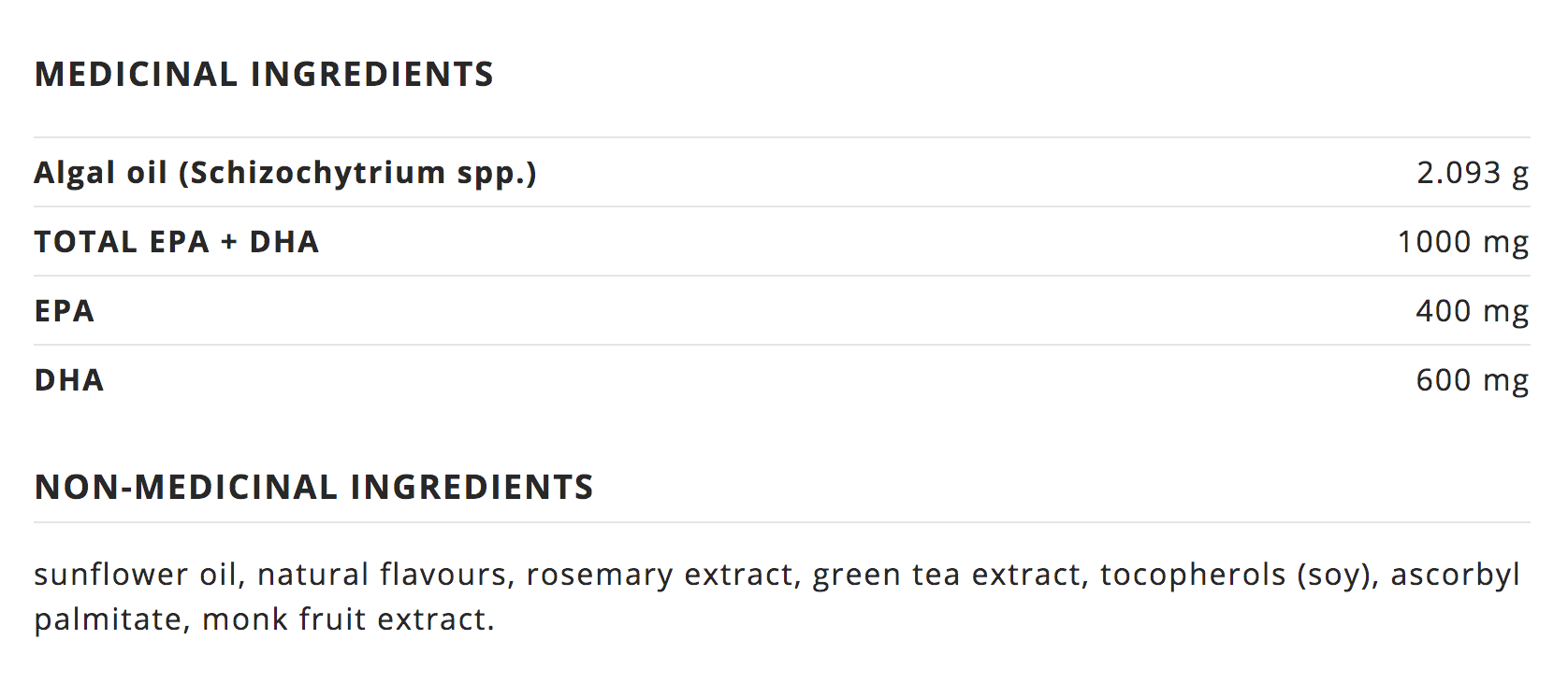 Huile d'algue (Schizochytrium spp.), huile de tournesol, arômes naturels, extrait de thé vert, extrait de romarin, tocophérols (dérivés de soya sans OGM), palmitate d'ascorbyle, extrait de fruit des moines,.