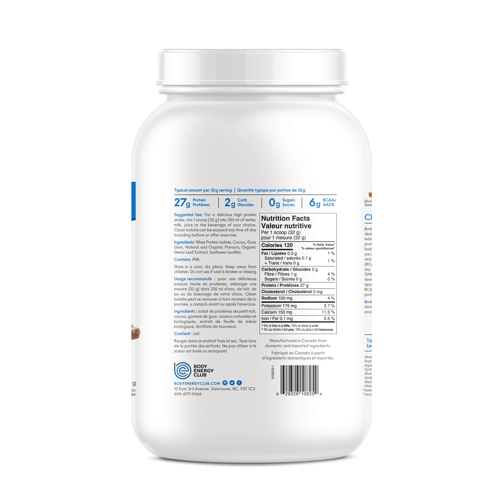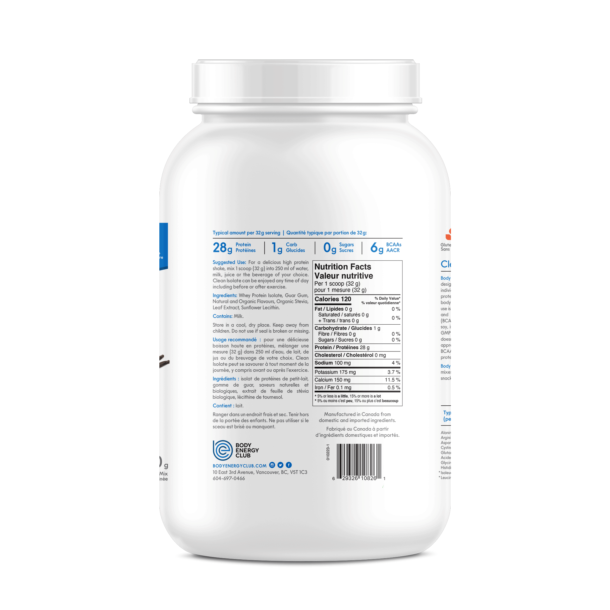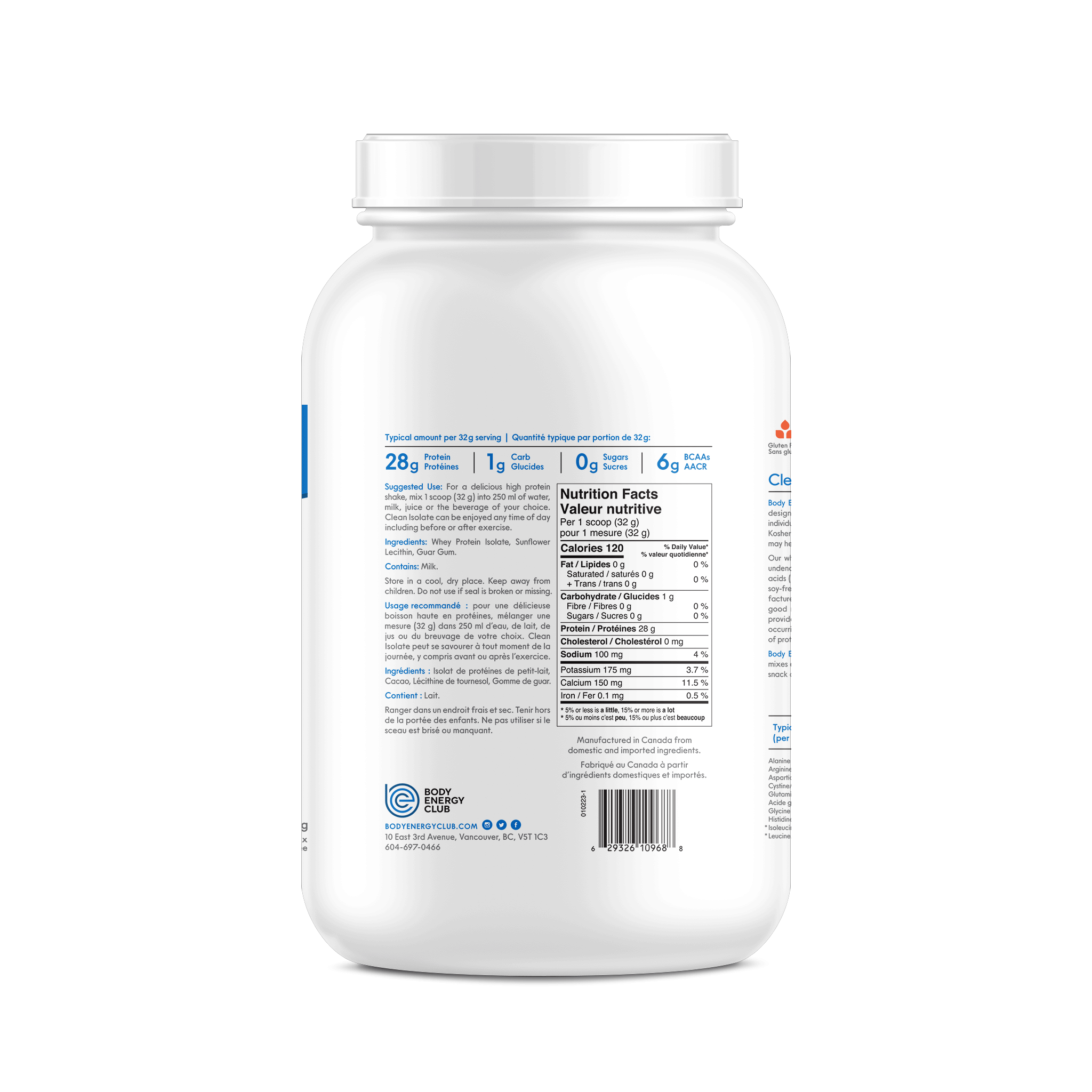 Suggested Use: For a delicious, high protein shake, mix 1 scoop (32 g) into 250 ml of water, milk, juice. Clean Isolate can be enjoyed anytime of day, including before or after exercise.