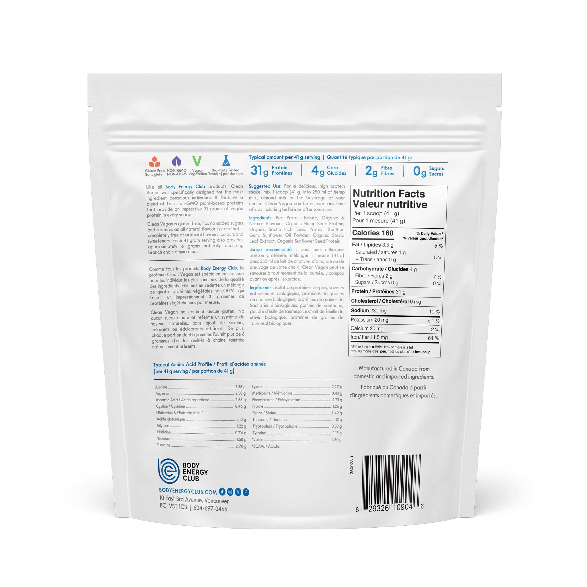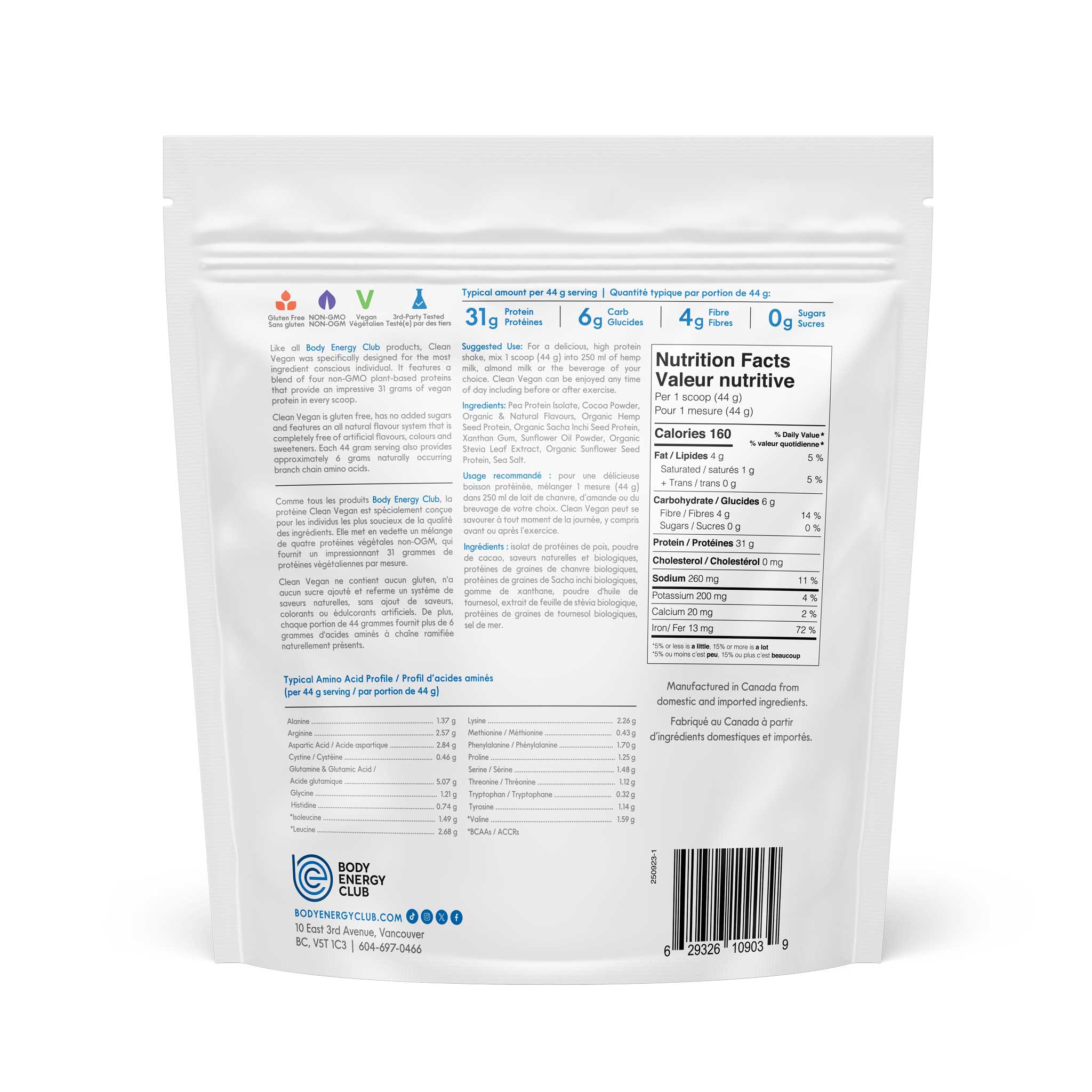 Like all Body Energy Club products, Clean Vegan was specifically designed for the most ingredient-conscious individual.* It features a blend of four Non-GMO plant-based proteins that provide an impressive 30-31 grams of vegan protein in every scoop.