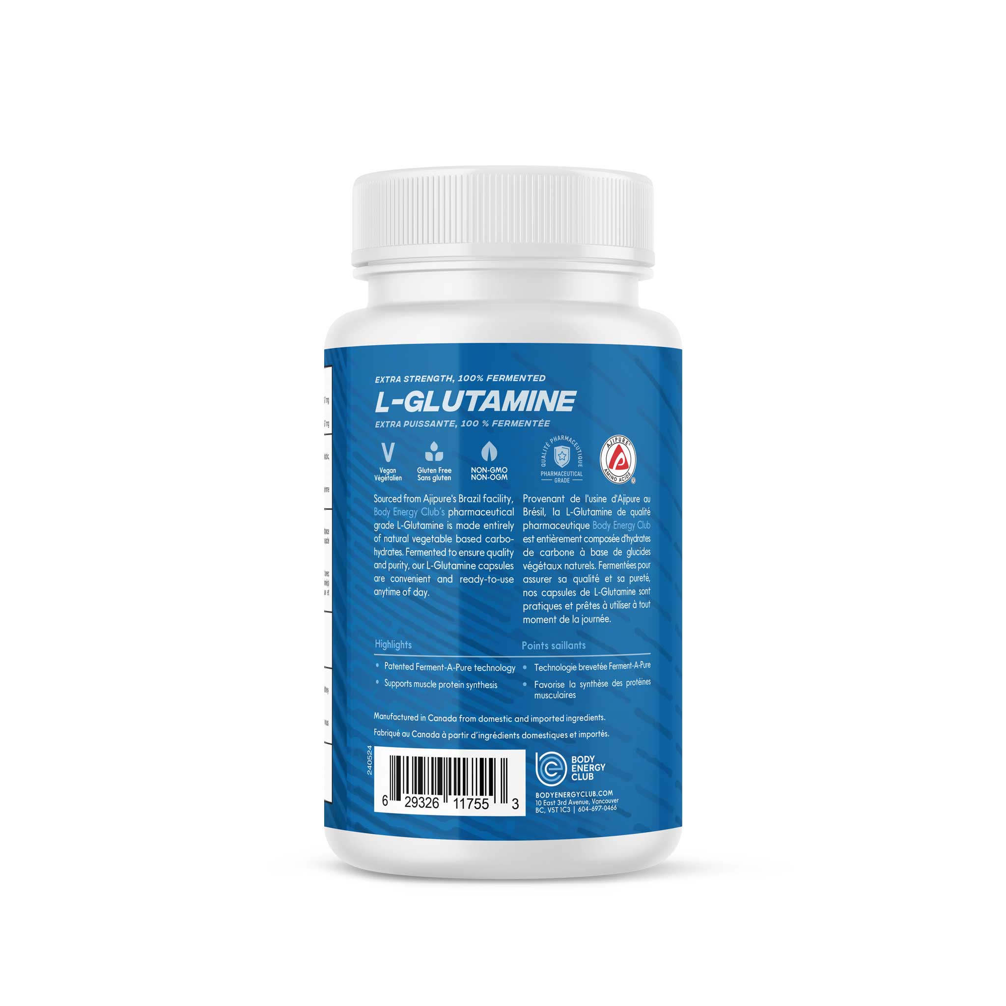Body Energy Club's L-Glutamine is sourced from Ajipure, the industry leader in fermentation technology. BEC L-Glutamine is made entirely from natural vegetable-based carbohydrates, yielding unsurpassed quality and purity. Now in a NuMag capsule free of Magnesium Stearate.