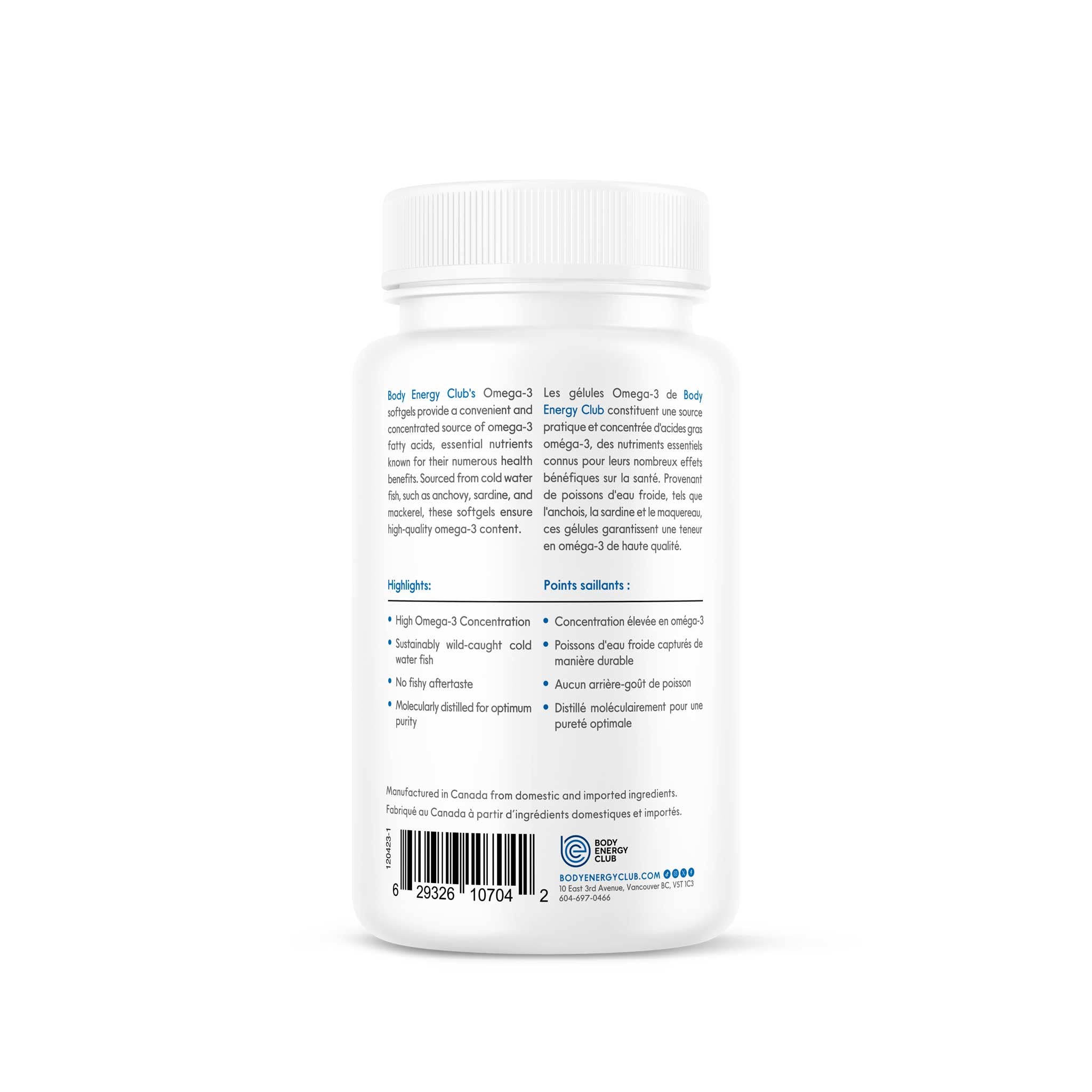Body Energy Club's Omega-3 contains 1000mg of fish oil, providing 400mg of EPA and 200mg of DHA. It is a molecularly distilled high-quality fish oil derived from sustainably wild-caught cold water fish from clean ocean sources.