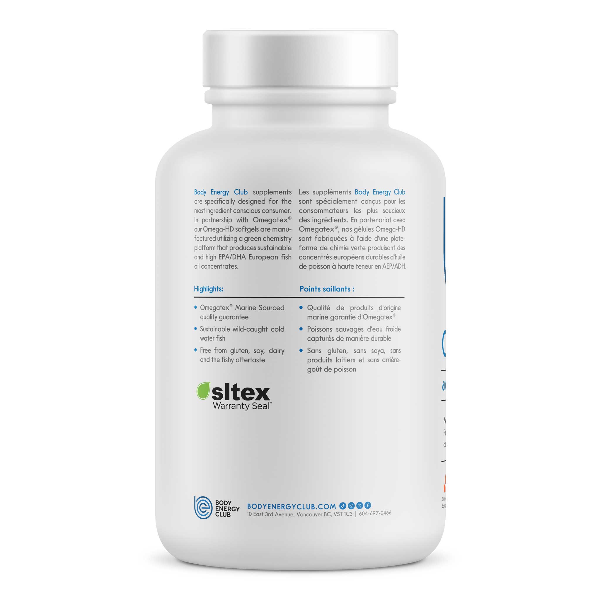 Body Energy Club's Omega-HD is a high-potency Omega-3 containing 1200mg of fish oil, providing 600mg of EPA and 240mg of DHA. It is a molecularly distilled high-quality fish oil derived from sustainably wild-caught cold water fish from clean ocean sources.