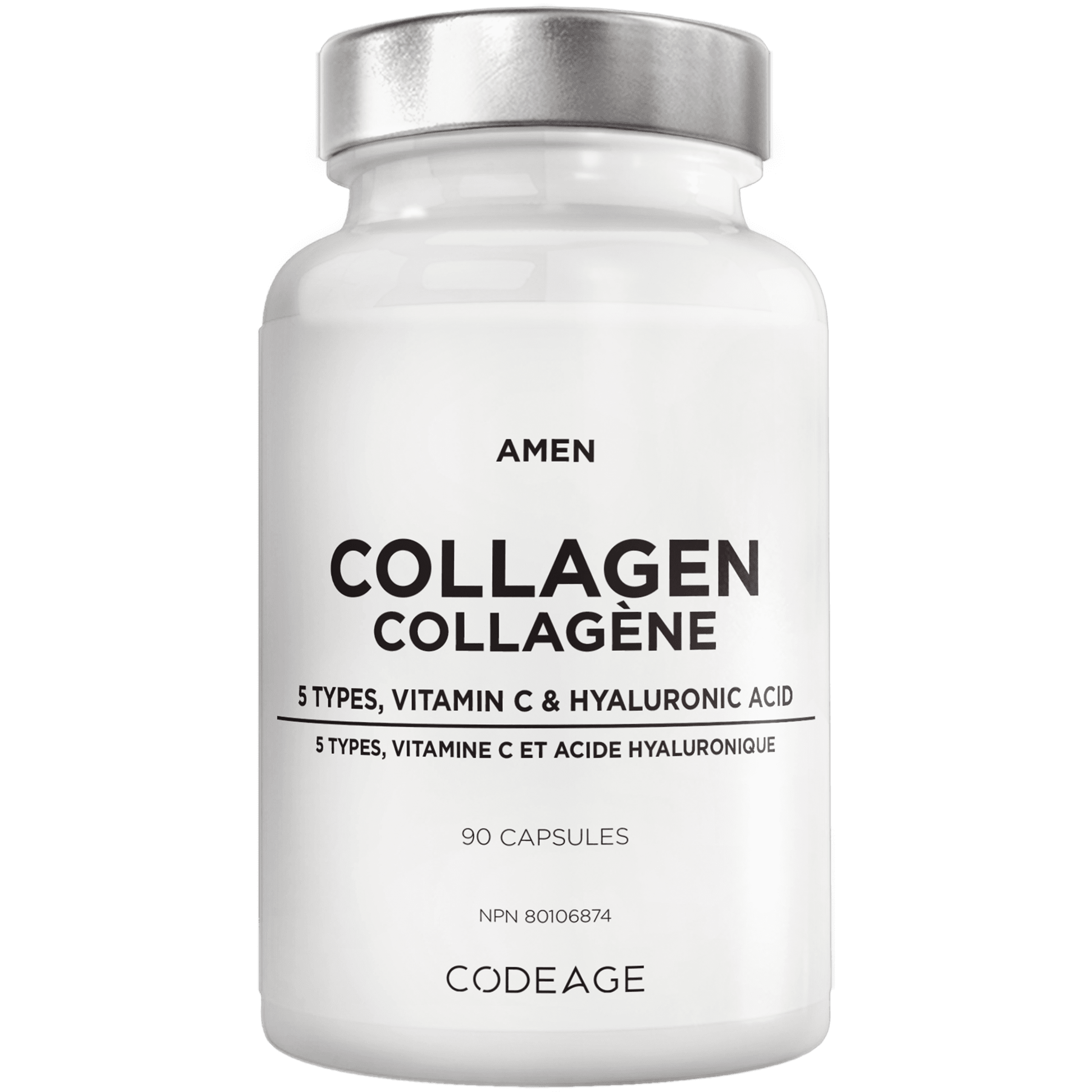 • Amen Collagen capsules include 5 types of collagen (Type I, II, III, V, and X) from premium sources, including grass-fed hydrolyzed bovine collagen peptides, chicken cartilage, and eggshell membrane collagen. This formula is free from shellfish.