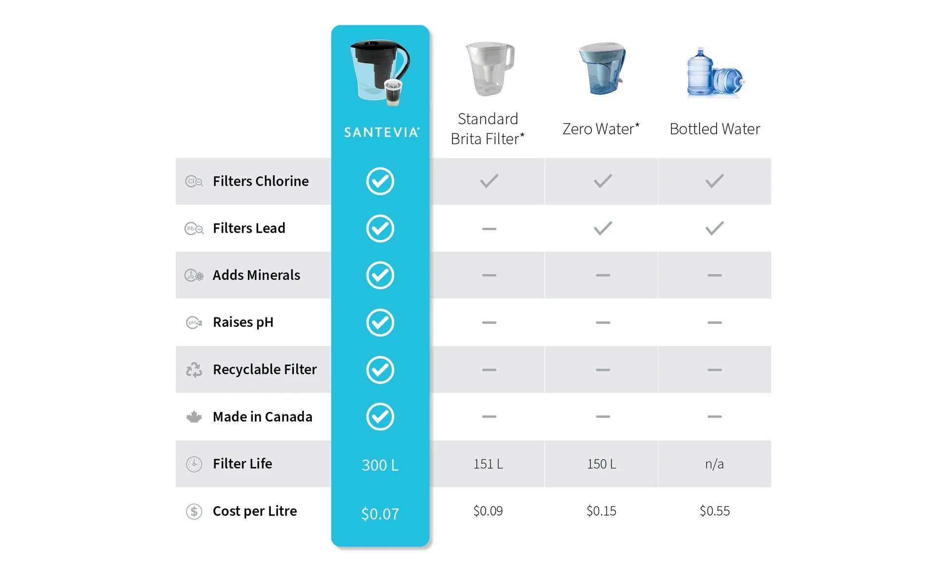Today's water is processed. City tap water treatment removes healthy trace minerals and reduces alkalinity (pH) while adding harsh chemical disinfectants. Santevia takes out tap water contaminants and restores natural minerals in your water giving you clean, mineralized and naturally alkaline water, the way nature intended. Healthy never tasted so good.