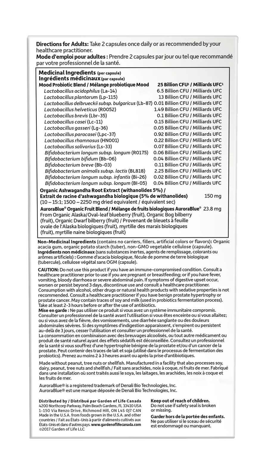 Garden of Life Dr. Formulated Probiotics Mood + is a unique probiotic formula with clinically studied strains to support mood and includes Organic Ashwagandha and Organic Alaskan Blueberries. Just 2 capsules a day support emotional health, well-being, and help manage chronic stress.