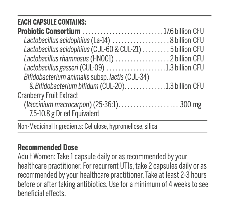 Adult Women: Take 1 capsule or as recommended by your healthcare practitioner. For recurrent UTIs, take 2 capsules daily or as recommended by your healthcare practitioner. Take at least 2-3 hours before or after taking antibiotics. Use for a minimum 4 weeks to see beneficial effects.