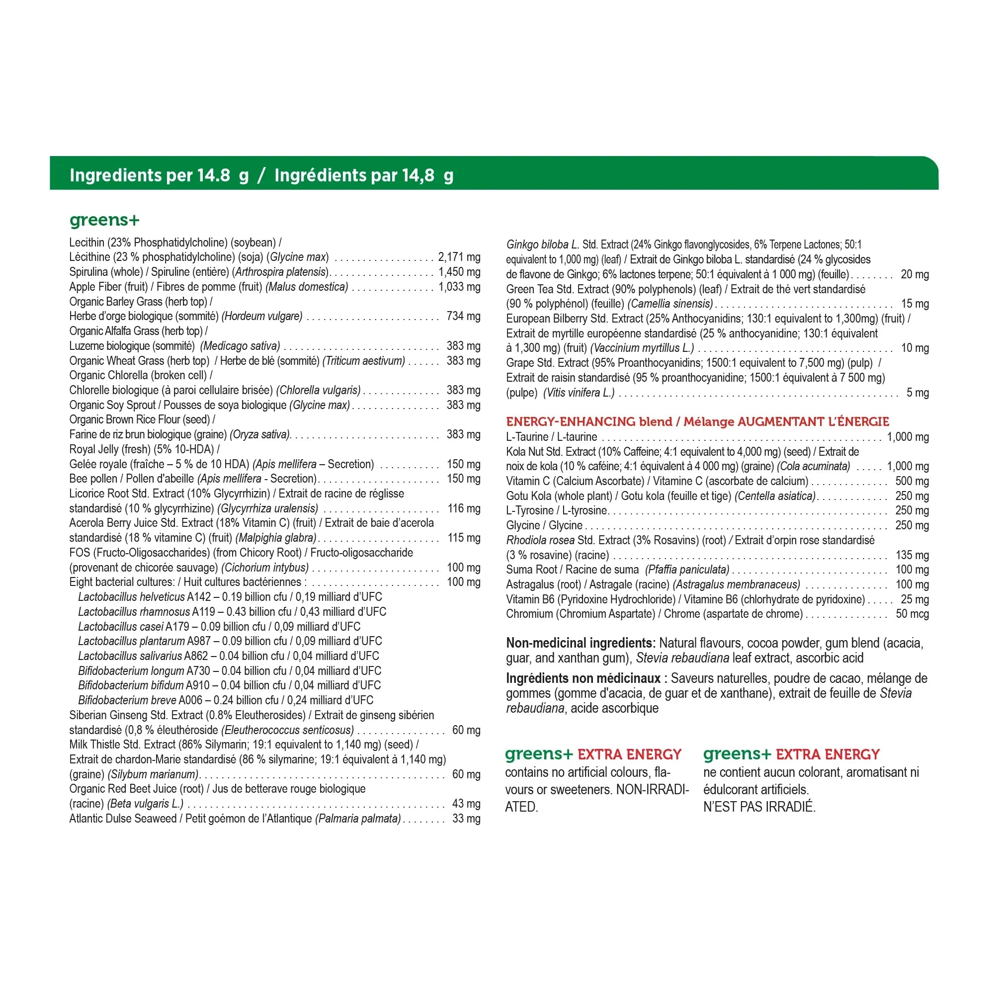 Whether it is first thing in the morning to wake you up, energize before your workout, or just to get over that 3pm workday slump, greens+ extra energy works to provide long-lasting energy – from all-natural sources. No sugary energy drinks or coffee necessary!