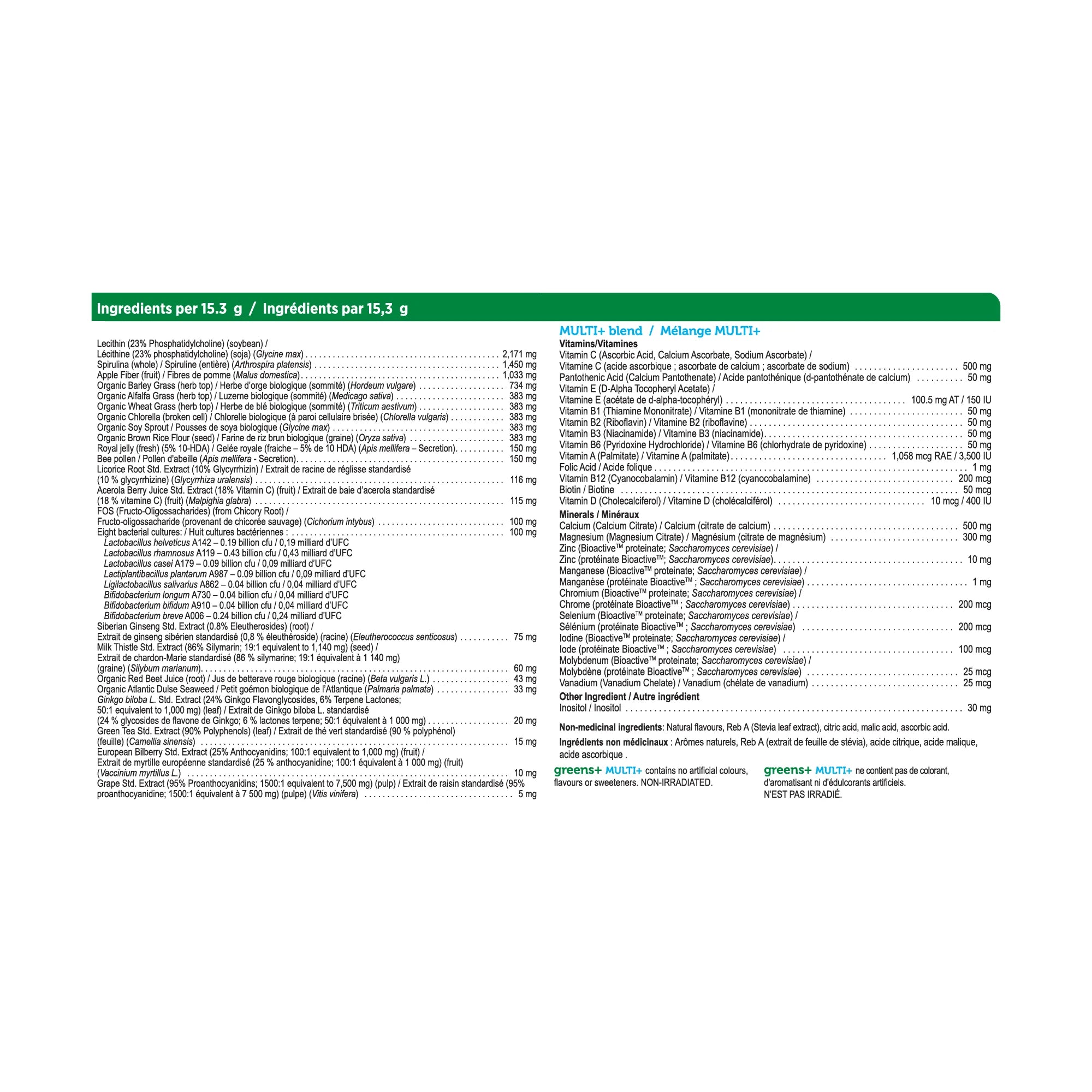 Recommended dose (adults): Mix 1 scoop (15.3g) in 1.5 cups (375mL) of pure water. Shake well. Take with food a few hours before or after taking other medications. If you are a new user of greens+, begin with 1/3 of a scoop daily and gradually increase to a full scoop daily over a 3 week period.