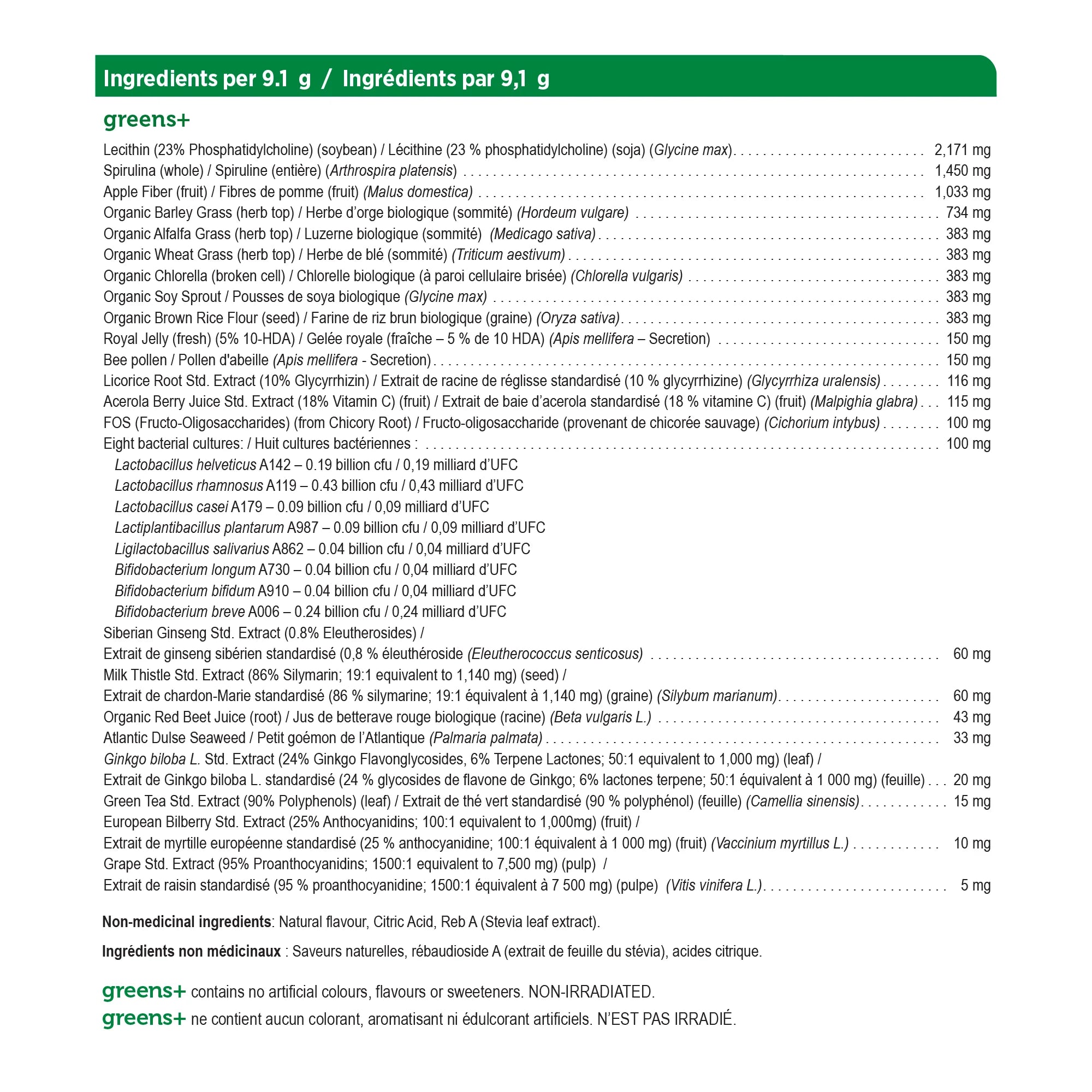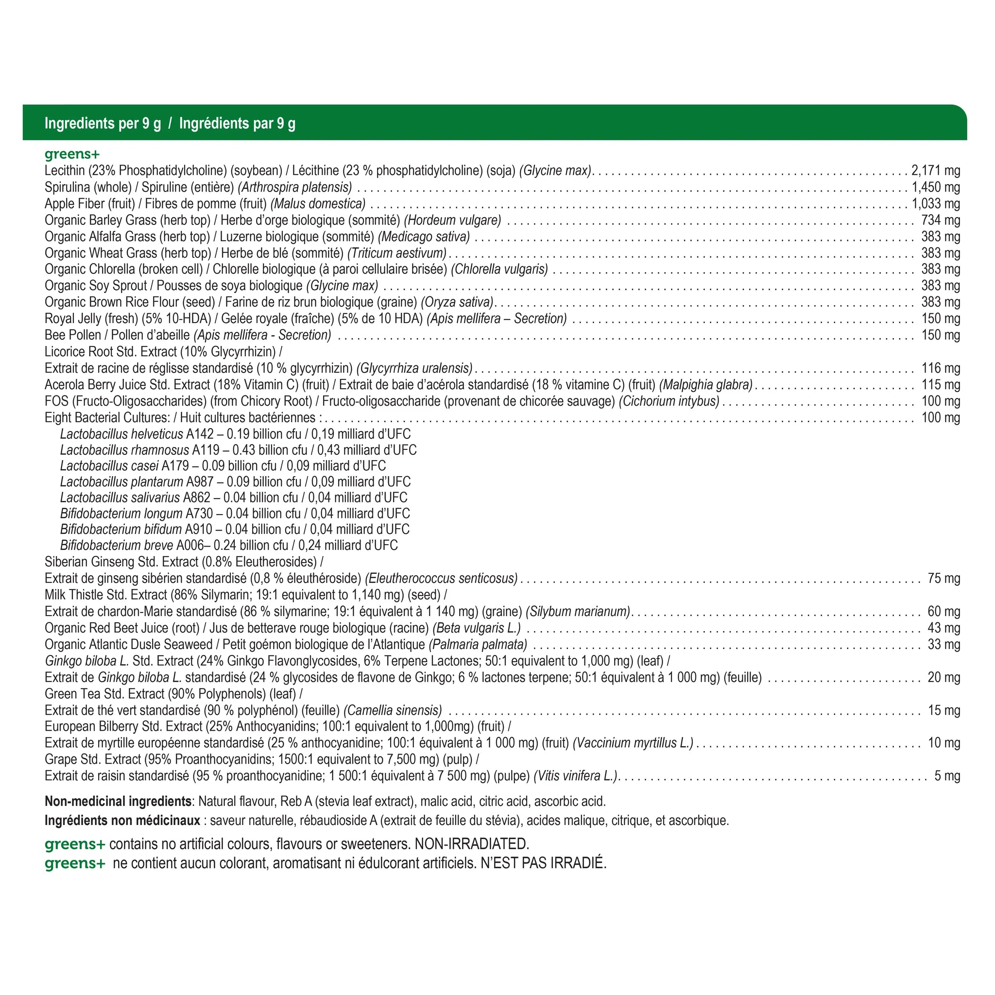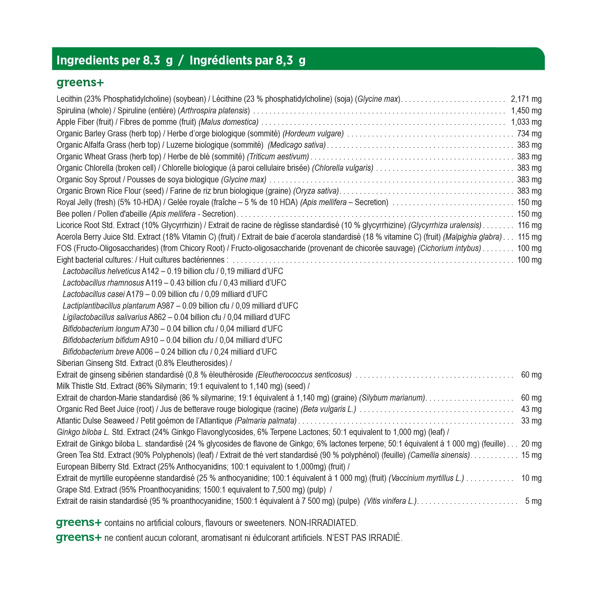 Recommended dose (adults): Mix 1 scoop (8.3 g) in 1 cup (250mL) of pure water. Shake well. If you are a new user of greens+, begin with 1/3 of a scoop daily and gradually increase to a full scoop daily over a 3 week period.