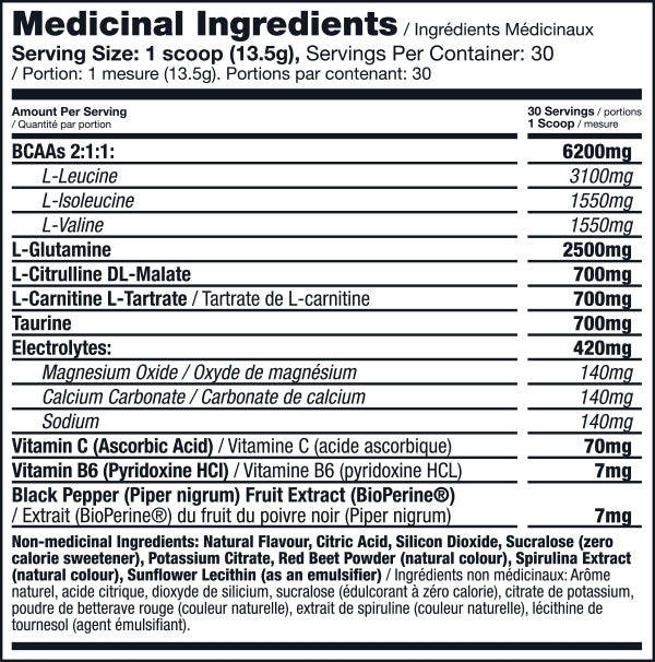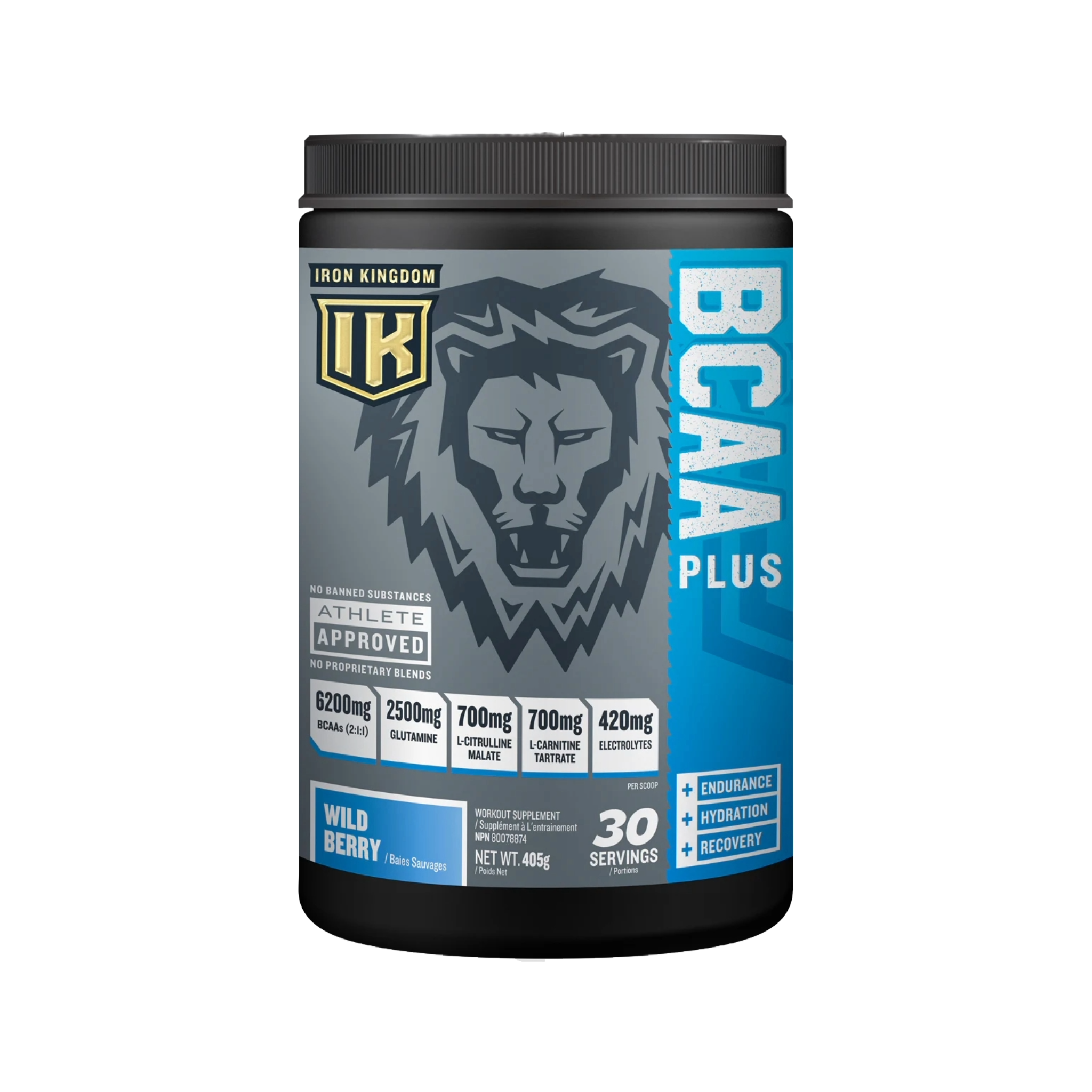Iron Kingdom BCAA Plus is formulated to help support growth, endurance and recovery*. BCAA Plus uses the proven 2:1:1 ratio of Branched Chain Amino Acids (BCAAs): L-Leucine, L-Isoleucine and L-Valine (6,200mg total BCAA's per serving) to assist with rapid recovery during and post exercise.
