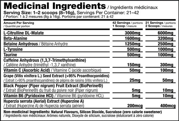 IRON KINGDOM's PRE-Workout contains a powerful energy and increased focus complex of both Caffeine Anhydrous (300 mg) and Huperzine-A (400 mg).