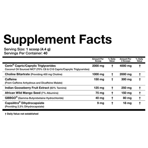 Cerin MCT's are fatty chains composed of 8–10 carbons and are different from long-chain fatty acids. MCTs go directly from the gut to the liver, where they are used as a source of energy or turned into ketones – a source of brain fuel. Because the calories in MCTs are used right away, they are not able to be stored as fat, especially on a low-calorie diet.