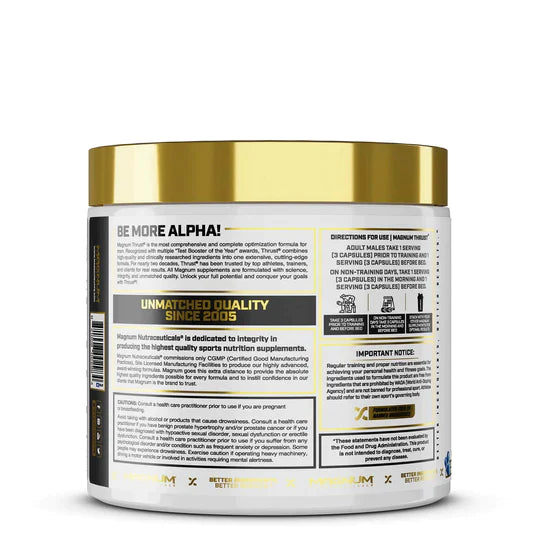 Magnum Thrust should be taken on an empty stomach; however, the powerful compounds utilized in Magnum Thrust may upset your stomach without the presence of food. Try taking Magnum Thrust both ways and find out what works best for your body.