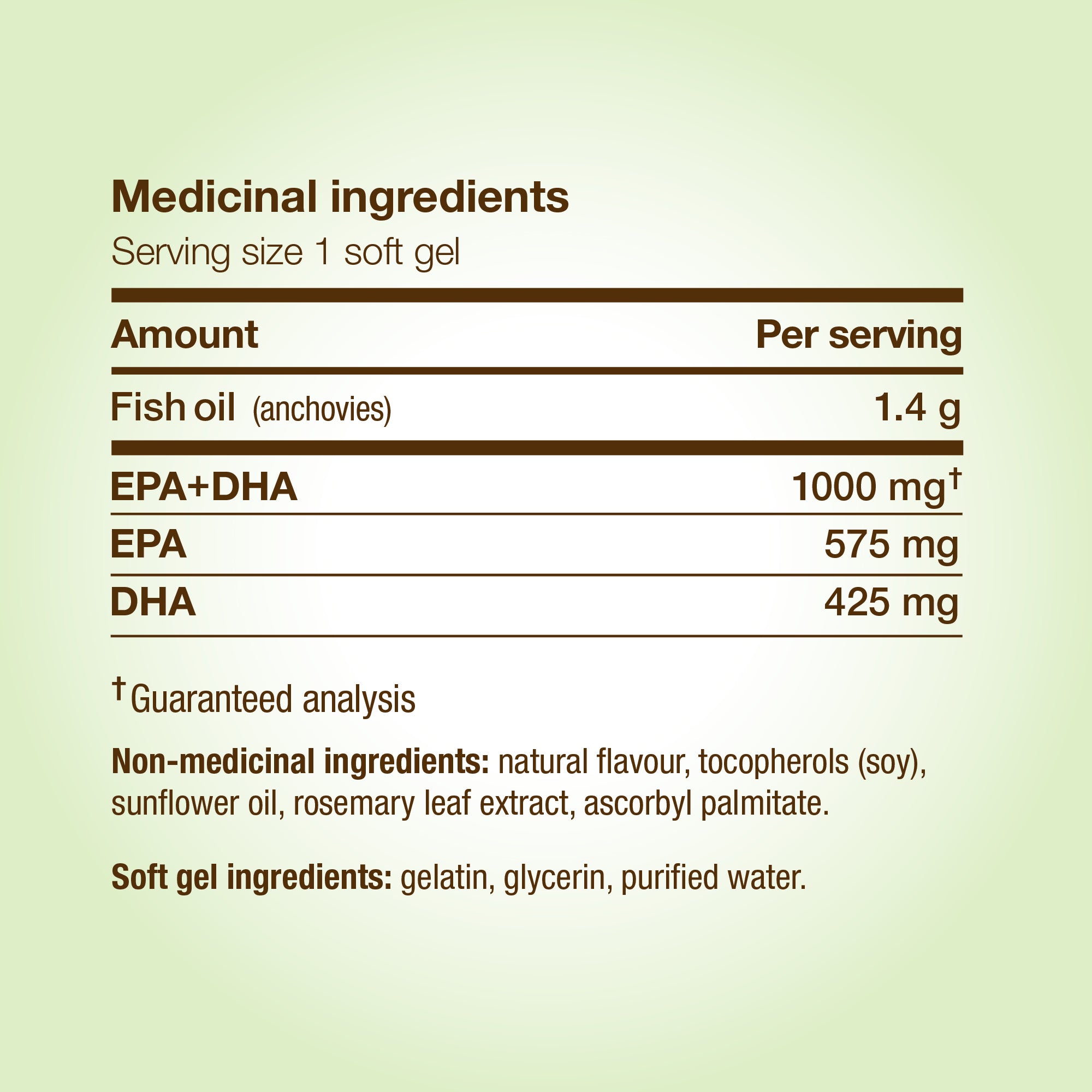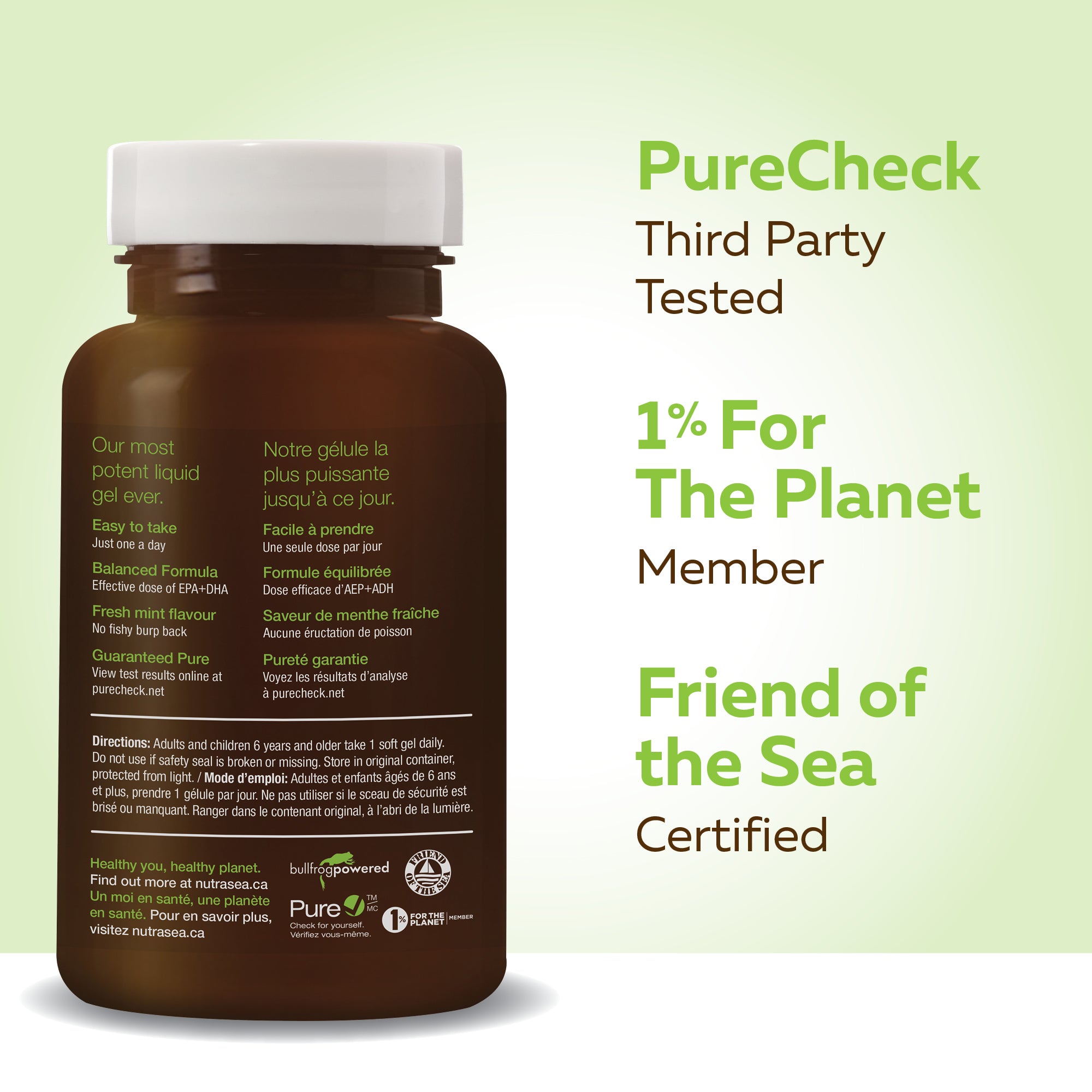 NutraSea Omega-3 in just one liquid gel a day, for the maintenance of good health; 575 mg of EPA + 425 mg DHA.