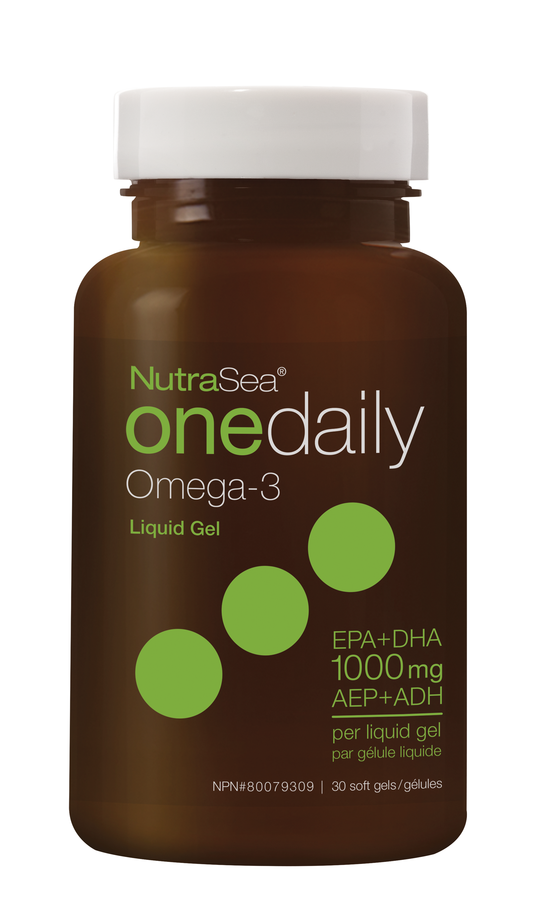 NutraSea One Daily premium quality omega-3 liquid gels have a fresh mint flavour and no fishy burp-back. With a balanced ratio of 575 mg EPA and 425 mg DHA per dose, NutraSea is an easy way to get your omega-3 and is a great choice for anyone looking for a pure and balanced omega-3. NutraSea supports the maintenance of good health, cardiovascular health and brain function.*