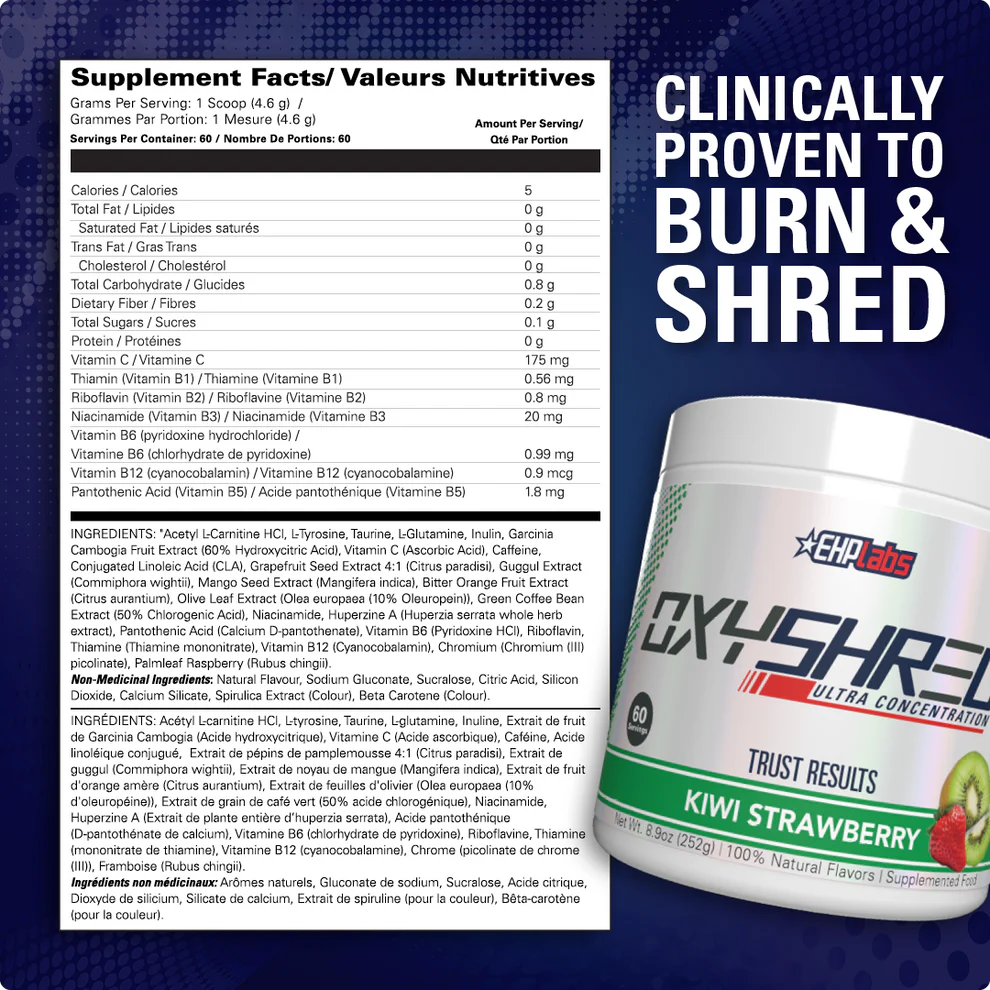 OxyShred Thermogenic Fat Burner is a dietary supplement product which contains caffeine and is not recommended for individuals sensitive to caffeine. Not intended for use by persons under age 18. Do not exceed recommended dose. Consult with your physician if you are pregnant or nursing, if you are taking medication, or if you have a medical condition. Discontinue use 2 weeks prior to surgery. Store out of sunlight in a cool, dry place. This product is not a sole source of nutrition and should be consumed in conjunction with a nutritious diet. This product should be used in conjunction with an appropriate physical training or exercise program to deliver the represented weight loss claims. Do not use if outer safety seal is broken. Keep out of reach of children.