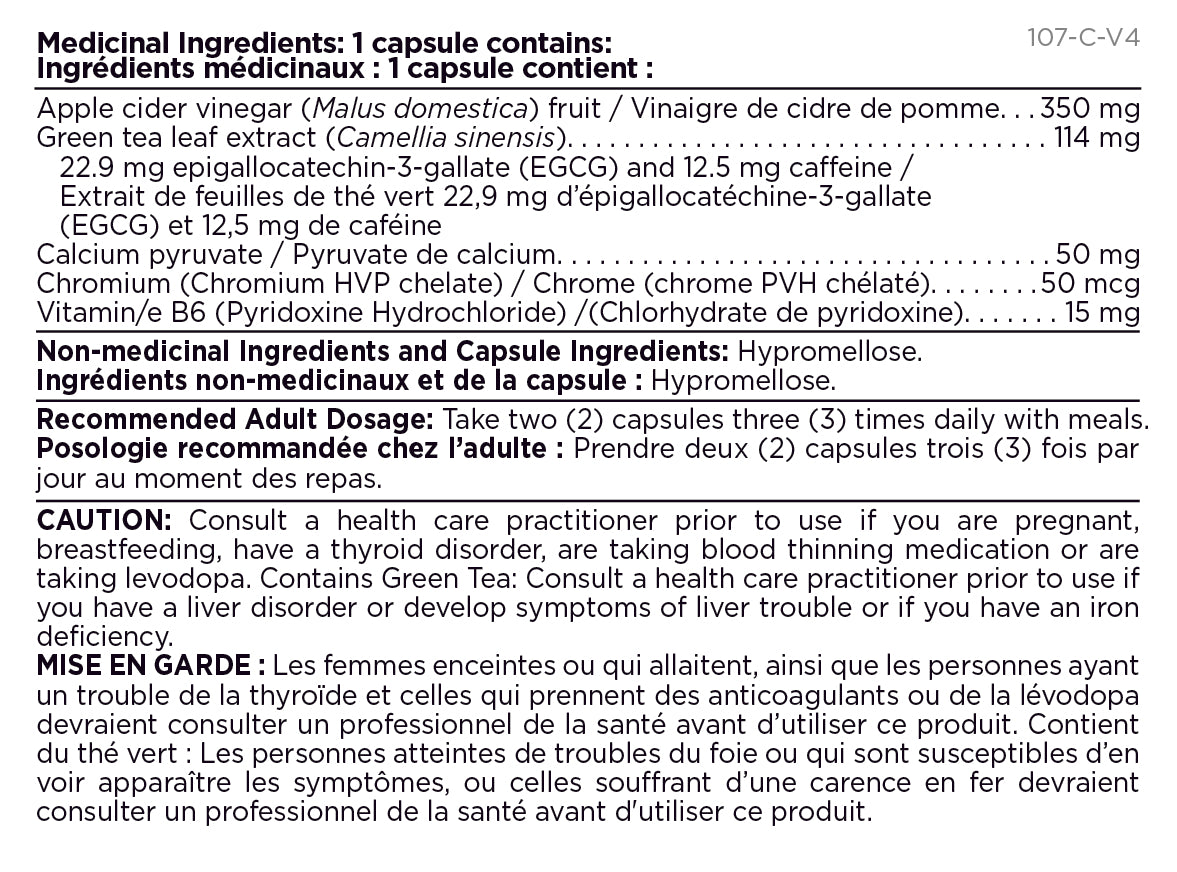 Combines apple cider vinegar with green tea, calcium pyruvate, dietary chromium, and vitamin B6 to help manage weight when combined with exercise and a healthy diet.