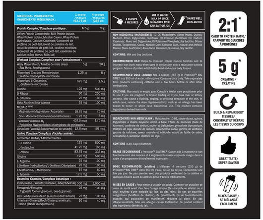 Mix 4 scoops (250 g) of Precision Big Time into 650 ml of water, milk or juice. Consume 1 serving daily (for a minimum of 4 weeks) or as directed by a health care professional.