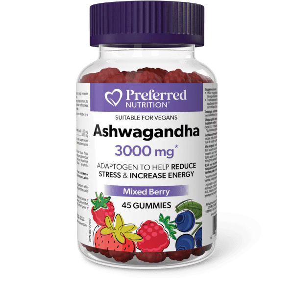 Preferred Nutrition Ashwagandha provides a traditional herbal formula delivered in delicious, berry-flavoured, vegan gummies. Ashwagandha is used in herbal medicine as an adaptogen to help increase energy and resistance to stress. Each gelatin-free gummy contains 200 mg of ashwagandha extract, the equivalent of 3000 mg of dried herb, for people with stress-related fatigue.