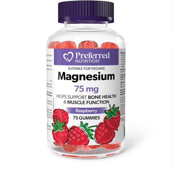 Preferred Nutrition Magnesium provides a highly absorbable form of magnesium delivered in delicious, raspberry-flavoured, vegan gummies. Magnesium is an essential mineral that helps maintain normal muscle function, bone development, and energy metabolism. Each gelatin-free gummy contains 75 mg of magnesium, making it a convenient and tasty way to supplement your magnesium intake.
