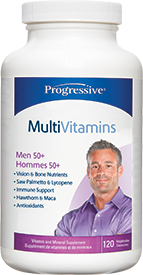 Progressive MultiVitamin for Men 50+ contains ingredients like Saw Palmetto, Lycopene, Hawthrone, Maca, Multivitamins and minerals among other ingredients. It's a good source of vision and bone nutrients*.