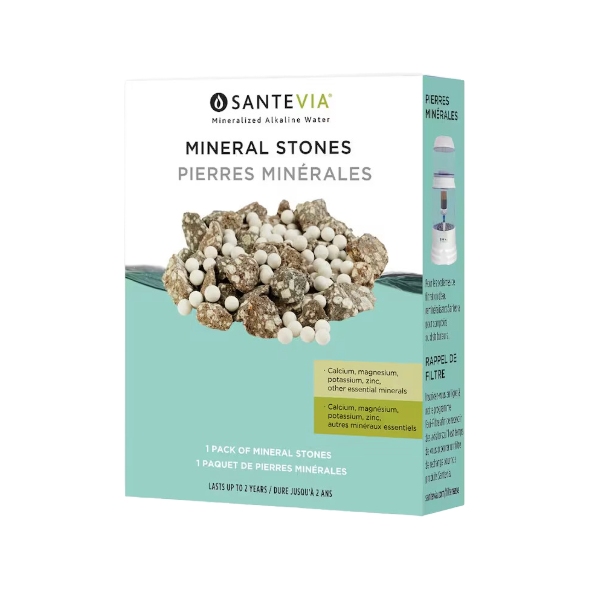Santevia Mineral Stones is the 7th stage in the Santevia Gravity System. It contains a combination of Maifan Stones and bio-ceramic energy balls. During this stage in the process, mineral stones continuously release easily absorbed, ionized minerals into the water, including calcium, iron, magnesium, potassium, zinc and other trace minerals. It raises the pH level by about 1.5 to 2.0 units.