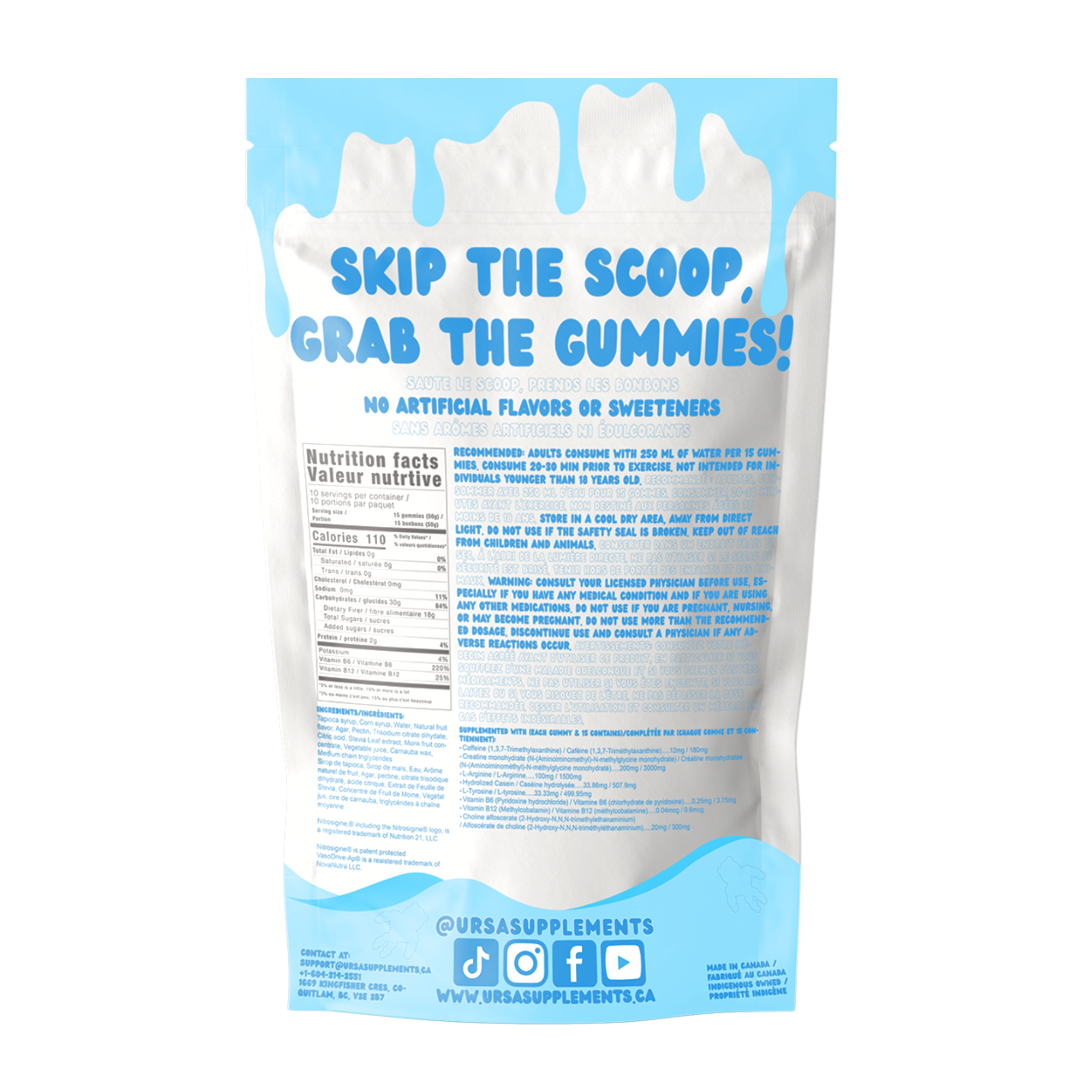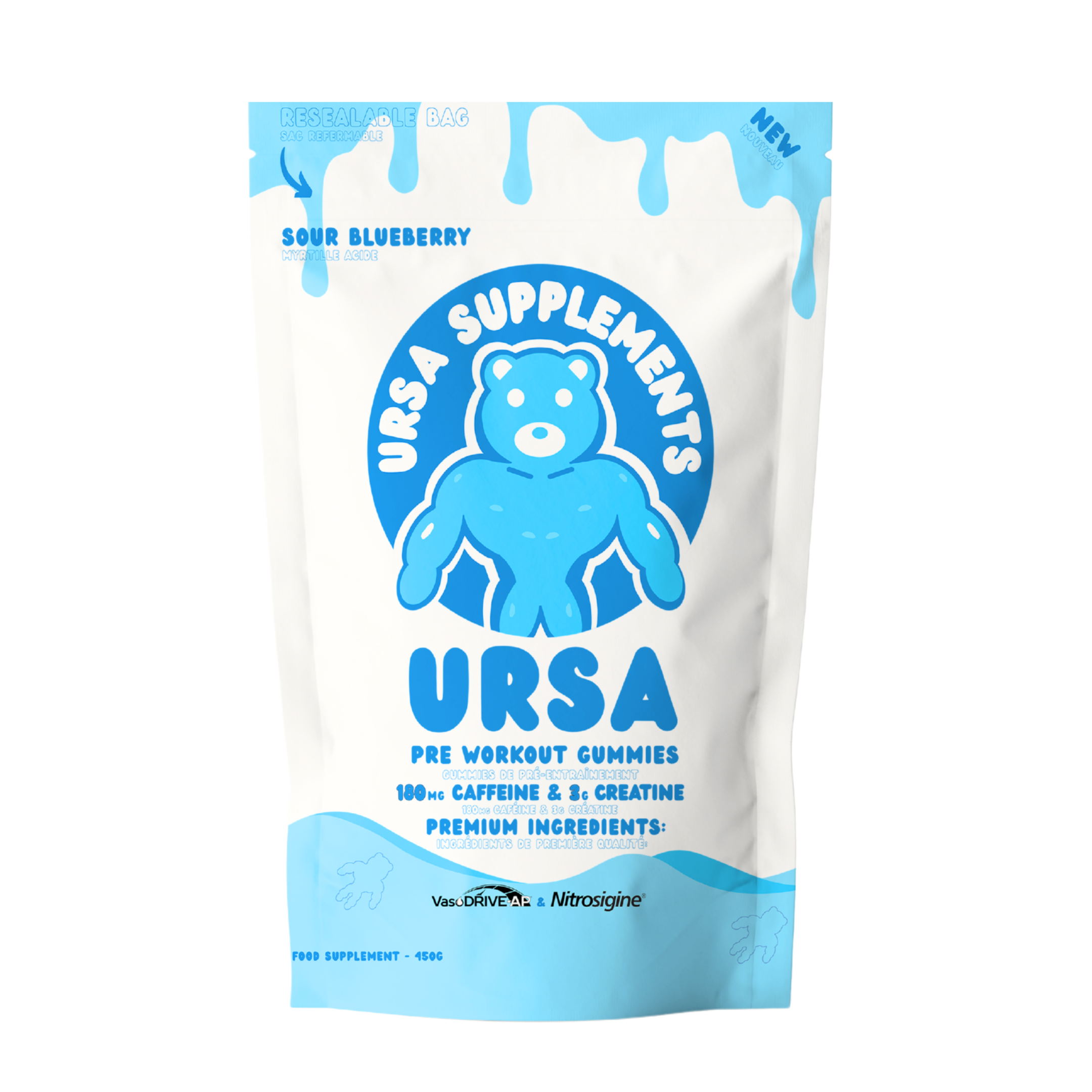 Ditch the shaker bottle! URSA Sour Blueberry Pre-Workout Gummies deliver everything you need for an effective workout in a convenient, delicious format. Each gummy is packed with clinically backed ingredients like Creatine Monohydrate for muscular endurance, Alpha GPC and L-Tyrosine for cognitive sharpness, and natural caffeine for a smooth, crash-free energy boost. To take performance to the next level, we've added Nitrosigine®, a patented complex of arginine and silicon that enhances nitric oxide levels, supporting increased blood flow and better muscle pumps. VasoDrive-AP®, a powerful bioactive peptide, works synergistically to improve circulation and oxygen delivery, helping you push harder for longer. With a mouthwatering sour blueberry flavor, these gummies provide a clean, effective alternative to traditional pre-workout powders and energy drinks. Whether you're hitting the gym, going for a run, or need a productivity boost, URSA helps you power through with ease.