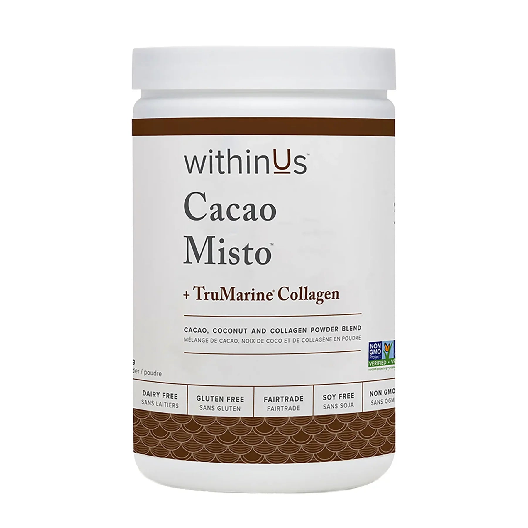 withinUs Cacao Misto™ + TruMarine® Collagen is a delicious, nutritious blend with the added benefits of certified organic, Fair Trade cacao and withinUs™ TruMarine® Collagen. Enjoy Cacao Misto by simply adding hot water, or half hot water and half warm milk/dairy-free alternative.